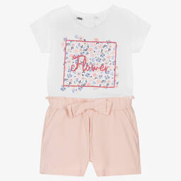 Pink and navy blue shorts set for girls by Italian brand iDO Baby, made in the softest cotton jersey. The T-shirt has a charming ditsy floral pattern with 'Flower' printed in glittery letters on the front, trimmed with sparkly diamantés. There are useful button fastenings on the back. The shorts have an elasticated paperbag waist with a bow appliqué and front pockets to create an easy, effortless outfit.