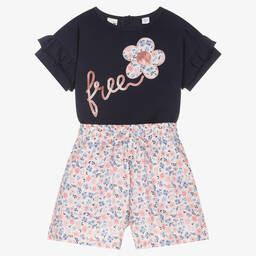 Gorgeous white shorts set for girls by Italian brand iDO Baby. The cotton jersey T-shirt has a flower design with 'free' in rose gold sequins and ruffle-trimmed sleeves. There are useful button fastenings on the back. Patterned in a ditsy pink and blue floral print, the shorts have a stretchy drawstring waist and front pockets.