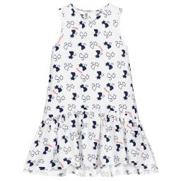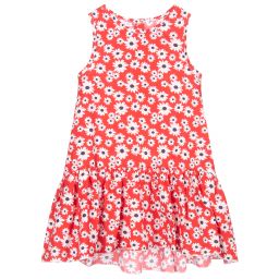 Neon pink dress for younger girls by iDO Baby, made in soft, lightweight cotton. It has an all over ivory hearts print and a ruffle hem, which is longer at the back than the front.
