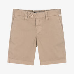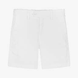 Navy blue Bermuda shorts for boys from luxury Italian brand Il Gufo. Made in lightweight cotton twill with a light stretch, they are cool and comfortable to wear. They fasten with a zip and two buttons for a secure fit, whilst an internal adjustable waist allows for a little growth. A small logo tab is stitched to the hem above one of the front pockets for a subtle designer touch.