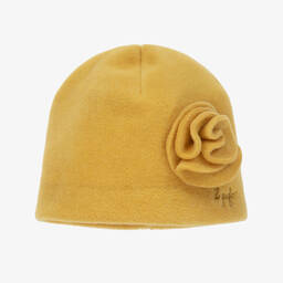 Navy blue, super soft fleece beanie hat for girls by luxury Italian brand Il Gufo. It has a 3D flower appliqué on the front above the embroidered logo.