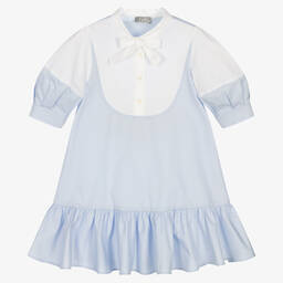 Smart casual navy blue cotton dress for girls by luxury, classic Italian designer Il Gufo. Made in lightweight poplin, it has a pale blue bib front with a fixed bow and logo button fastenings. The voluminous bubble sleeves are pleated around the cuffs and the hemline has a deep frill.