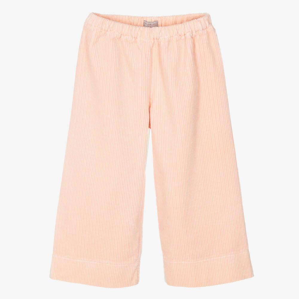 Light pink wide-leg trousers for girls by luxury Italian brand Il Gufo, made in soft cotton corduroy. These smart casual trousers have an elasticated waistband for comfort.