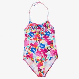 Pretty pink swimsuit for girls by luxury Italian brand Il Gufo. Silky and stretchy and fully lined, it has a pink and red flower on one side and cross-over shoulder straps. The designer's red logo is printed around the back.