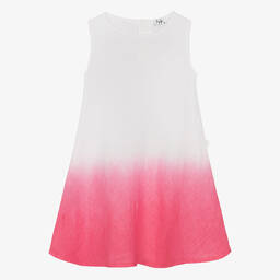 Girls white and blue ombré dress by Il Gufo is made in soft, lightweight linen. This pretty dress features a loose A-line shape, making it ideal for warmer days. The sky-blue hem and ombré effect on the skirt add a touch of elegance. It has convenient button fastenings on the back and a small logo tab on one side seam for a subtle designer finish. Limited quantities available, last chance to buy.
