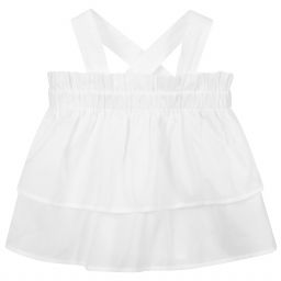 Girls pretty yellow blouse by Il Gufo. It is made from lightweight and slightly sheer cotton with two tiers. There are adjustable shoulder straps which fasten with buttons and it is elasticated around the top.