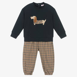 Pink top and trouser set for little girls by Il Gufo, made in soft and stretchy cotton jersey. The top has a tulle trim and a pink embroidered logo on the chest. The matching trousers have an elasticated waist for a comfortable fit.