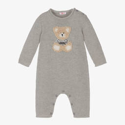 Beautifully soft pale pink romper suit for baby girls by Italian brand, Il Gufo. Knitted in luxurious extra fine Merino wool, which is ethically sourced and environmentally friendly, it has rolled trims and an adorable textured teddy design in beige and grey. There are button fastenings on the shoulders and between the legs for easy changing.