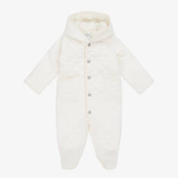 Cosy beige pramsuit for baby boys by Emporio Armani, made in soft cotton-blend jersey with a warm, fleecy inside. Ideal for cooler days, it has a sweet logo motif on the chest, patch pockets, and a comfortable hood with adorable bear ears on top. Lined in a smooth cotton blend, it has a charming logo pattern and fastens with shiny branded poppers.