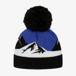A sparkly navy blue hat for little girls by Jamiks, knitted in a soft wool and cashmere blend. Lined in comfortable cotton jersey, it has an ivory faux fur pom-pom on top, with beautiful blue and ivory floral appliqués. The hat secures with knitted ties under the chin.