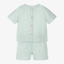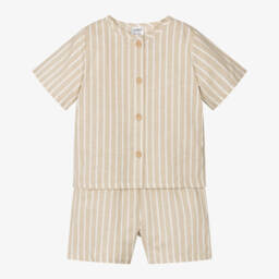 The boys green stripe short set by Jamiks combines lightweight linen and cotton for a breezy, comfortable fit perfect for spring and summer. The short-sleeved top features charming wooden button fastenings, while the matching shorts offer an elasticated waistband ensuring easy wear and movement. Designed for junior boys, this beautifully crafted ensemble is ideal for warm days, making it a stylish and practical choice. Limited quantities available, so secure this delightful set today.