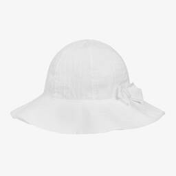 Dusky pink sun hat for little girls by Jamiks, made in soft and lightweight cotton. With pretty bows on the front and back, this practical accessory has a wide brim to help keep the sun out of precious eyes.
