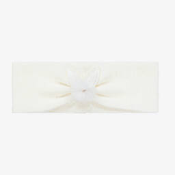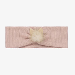 A pink headband for little girls by Jamiks, in a super soft ribbed knit. It has beige petal-shaped decorations with a faux fur pom pom on the front for a cute look.