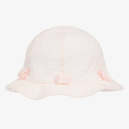 Pretty white sun hat for little girls by Jamiks, made in soft and lightweight organic cotton cheesecloth. The brim is trimmed with 3D floral appliqués and the open back is secured with an adjustable bow.