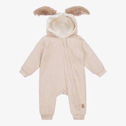 Ivory pramsuit for baby boys and girls by Jamiks, made in soft and stretchy, ribbed viscose-blend jersey. Warm and cosy, it is lined in soft polar fleece and has an attached hood with cute faux fur-trimmed 3D bunny ears on the top. It fastens easily on the front with a zip and has a beige logo patch on one leg.