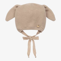 The girls pink cotton bunny ear hat by Jamiks is made in a soft cotton knit. This adorable design features lovely button ears on the top and a decorative wooden paw charm on the front. It includes ties to fasten under the chin for a secure fit. Limited quantities available, making it a last chance to buy this delightful piece.