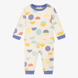 Exclusive to Childrensalon, an ivory cotton tracksuit for little girls by Joyday. Made in comfortable jersey patterned in colourful circles and with pink ribbed trims, the set is just right for casual days. The sweatshirt has useful popper fastenings on one shoulder, whilst the joggers have a drawstring waist for a good fit. Easy to wear, both pieces just pull on.