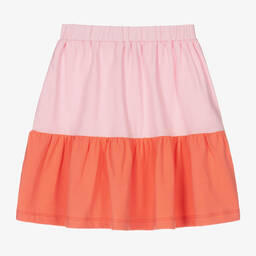 Colourful, casual cotton skirt for girls by Joyday, exclusive to Childrensalon and tiered in orange and red. Made in comfortable, lightweight jersey, it is gathered, full, and easy to wear, simply pulling up. It has an elasticated waistband to ensure a comfortable fit for little tummies.