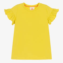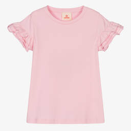 Red cotton T-shirt for girls by Joyday, exclusive to Childrensalon. Soft, comfortable and easy to wear, it is made in stretchy jersey with pretty layered ruffles on the short sleeves.