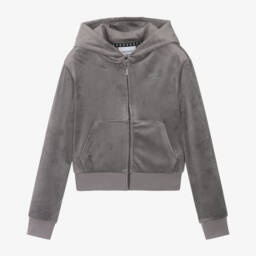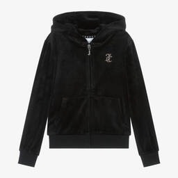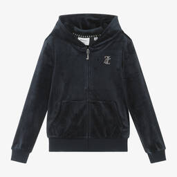 Girls blue velour zip-up top by Juicy Couture is crafted from super soft velour, offering a touch of luxury and comfort. The top features a fixed hood and pouch pockets for added cosiness, complemented by iridescent diamanté logos that deliver a glamorous flair. Ideal for cooler autumn and winter days, it provides warmth and style effortlessly. With limited quantities available, this is a last chance to buy.