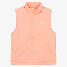 Navy blue padded gilet for teen boys and girls by KENZO KIDS, great for layering on colder days. It features a white box logo graphic on the front, with a matching larger version on the back, for a bold designer statement. Made in smooth water-repellent fabric, it is warmly padded with medium weight luxurious down and has fleece-lined pockets on the front. It fastens with a logo-embossed zip and has a toggle drawstring hem for shape and warmth.