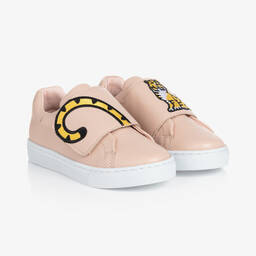 White trainers for teen boys and girls by KENZO KIDS, made in soft leather. Forming part of the brand's KOTORA capsule collection, they have a cute embroidered tiger and tail on the wide velcro fastening straps. They have a soft lining and lightly padded inner soles for comfort. There is a black logo print on the back of the padded heel and a tonal embossed logo on the back of the non-slip rubber outer soles for added designer detailing.