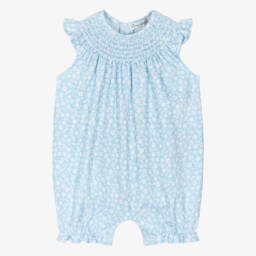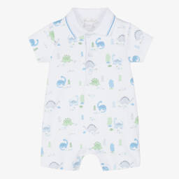 Boys blue watercolour whales shortie by Kissy Kissy, featuring adorable whale appliqué on the chest. Crafted from a soft Pima cotton blend terry towelling, it offers comfort and style. Popper fastenings on the shoulder and between the legs make changing easy. Limited quantities available, last chance to buy this charming piece.