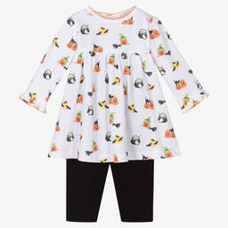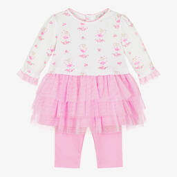 Lovely pale pink dress set for baby girls, by Kissy Kissy. Made in soft Pima cotton jersey, the dress has a sweet hand-embroidered pink flower design on the bodice, a tulle skirt, and ruffle trims. It pairs with matching pink leggings to complete the girly look.