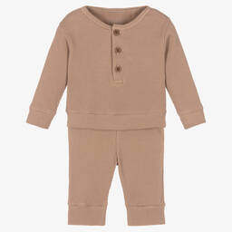 Lovely blue trouser set for baby boys by Kissy Love, made in super soft and stretchy Pima cotton jersey. Kind and gentle against delicate skin, this cute set is made in a sky blue waffle jersey. The top has wooden effect button fastenings on the front and the trousers have a comfortable elasticated waistband.