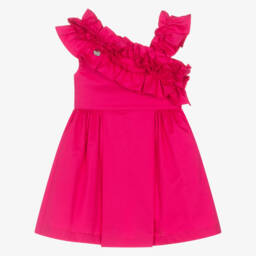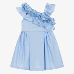 A delightful light blue ruffle dress for girls by Lapin House is crafted from soft poplin, perfect for spring and summer outings. The asymmetric shoulder design with charming ruffles adds an elegant touch, while a discreet zip on the side ensures easy dressing. Its silver-tone logo charm enhances the sophisticated look. With an above-knee length, it's ideal for any warm-weather occasion. Limited quantities available, so secure this beautiful piece today.