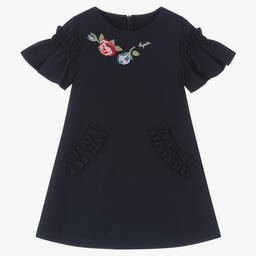A lovely navy blue dress for girls by Lapin House, made from super soft ribbed corduroy. There is a Peter Pan collar delicately signed with a glittery silver logo and lightly puffed sleeves. Sparkly layers of tulle fall beautifully from the bodice, zipping up neatly with a concealed zip at the back. It has a double layer of lightweight voile lining for a comfortable finish.
