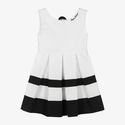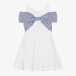 Pink dress for girls by Lapin House, made in soft lightweight cotton. It is printed with pretty flowers in blue, pink and yellow, and has a gorgeous pink silk ruffle down the front. The dress has a lightweight cotton lining and fastens with a concealed zip on the back.