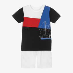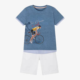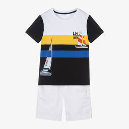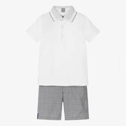 Chic shorts set for girls by Greek designer Lapin House, made in lightweight cotton. The pale pink and white striped top is cropped and has ties that fasten into a bow on the front. It has a ribbed collar and a floral print on one side. The white shorts have large, pleated patch pockets on the front with a sparkling pink logo on one side. They have a comfortable elasticated waistband with a frilled trim.
