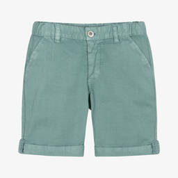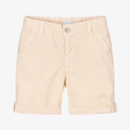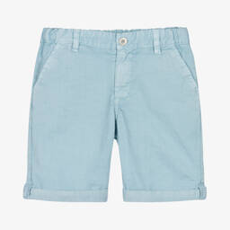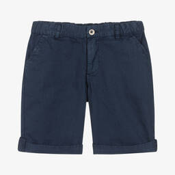 Blue cotton shorts for boys from Laranjinha, made in lightweight cotton twill. A useful wardrobe staple, they have classic styling with slanted pockets on the front, jetted pockets at the back, and fixed turn-ups. They fasten with a zip and button and have an adjustable waist for a comfortable fit. There is a small logo patch on the back for a discreet designer finish.