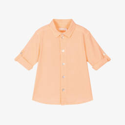 The boys green linen and cotton shirt by Laranjinha, crafted in a soft, lightweight fabric, offers a charming light green hue perfect for spring and summer. Featuring elegant mother-of-pearl buttons and convenient sleeve tabs for a casual rolled-up style, this shirt is both stylish and practical. Ideal for junior boys, it's a versatile piece for any wardrobe. Limited quantities available, so don't miss out on this beautifully woven top.