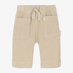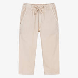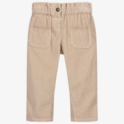 Girls coral pink wide-leg trousers from Chic by Laranjinha. They are made in super fine corduroy, with an elasticated, adjustable waistband. They fasten with a zip on one side and have a decorative grosgrain ribbon tie on the other side.