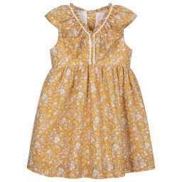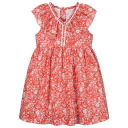 Navy blue and white Liberty print dress for girls by Chic by Laranjinha, made in soft lightweight cotton. The bodice has a pretty ruffle detail, with white ric rac trim and fastens on the back with buttons.