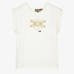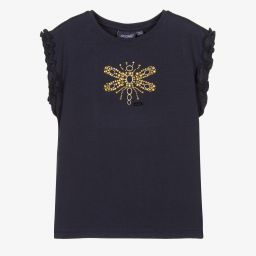 Girls navy blue T-shirt by Le Chic, made in soft and stretchy organic cotton jersey. The front has the outline of a dragonfly in sparkling gold diamantés and a navy blue metal logo plate. There are ruffles over the shoulders.