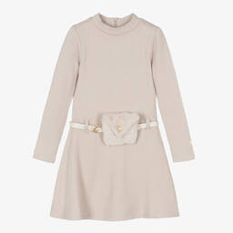 Lovely navy blue skater style dress for girls by Le Chic, made in a super soft viscose blend knit. This cosy dress has a rounded neckline and fastens easily at the back with a zip. The removable and adjustable belt comes with a gorgeous faux fur, popper-fastening pouch. For an extra designer touch, there is a small fabric logo tab sewn on the sleeve.