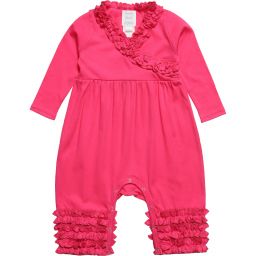 Lemon Loves Layette pale pink Pima cotton jersey 'Olivia' one piece babygrow for little girls. It has a fitted top and a comfortable, loose fitting shape below the waist. With elegant ruffles around the neck and cuffs, it has poppers that fasten between the legs.
