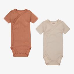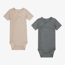 Baby girls and boys blue and yellow striped bodyvests by Liewood, made in ribbed organic cotton jersey. In a cross-over style, they have poppers on the front and between the legs. The designer's name is in tone-on-tone embroidery on the front.