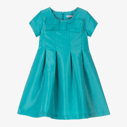 Exclusive to Childrensalon, this beautiful ivory special occasion dress for girls by Mama Luma, is handmade in luxurious satin. This stylish dress has capped sleeves, a large fixed bow on the front and a full box-pleated skirt. Fully lined for comfort in lightweight voile, it fastens neatly around the back with a concealed zip.
