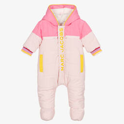 Pale blue with contrasting blue and green trims, this softly padded puffer snowsuit for baby boys is by MARC JACOBS. For instant brand recognition, it has the designer's name printed in green down the popper-fastening storm flap. Using recycled material, the fabric is silky smooth and has a cosy polar fleece lining, with striped ribbed cuffs for a snug fit, and detachable booties for added cosiness. There is an easy front zip fastening, side pockets and faux chest pockets.