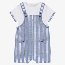 The boys beige stripe dungaree set by Mayoral is crafted from a lightweight cotton and linen blend. The white jersey T-shirt, with popper fastenings on one shoulder, contrasts beautifully with the beige-striped dungaree shorts. Functional and decorative buttons add a traditional touch, while popper fastenings between the legs ensure easy changes. Limited quantities available, so don't miss your chance to add this charming set to your little one's wardrobe.