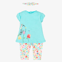 Orange leggings set for baby girls from Mayoral, made in soft sustainable cotton jersey. The white top has a cat print on the front, with 3D butterfly appliqués. It comes with orange leggings and a headband, both bearing a white spotted pattern, for a fully co-ordinated outfit.
