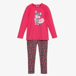 Beige top and navy blue leggings set for girls by Mayoral, made in soft cotton jersey. The top has a fun cat motif in blue and grey, with pretty gathers on the raglan sleeves. The leggings have an all-over beige heart print and a comfortable elasticated waist.