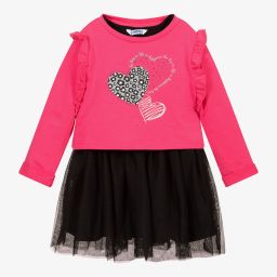 Sparkly dress set for girls by Mayoral. The navy blue dress is made in comfortable polycotton jersey, with navy blue tulle overlays on the skirt. The beige jersey top has sparkly silver stripes, ruffles over the shoulders and beige hearts printed on the front, with silver studs and the words 'the key to life is happiness' in glittery silver.