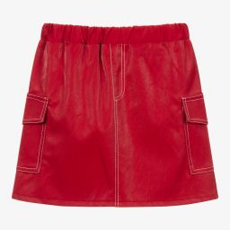 Black skirt for girls by Mayoral, made in mid-weight faux leather with a sheen. It has a comfortable, elasticated waistband and white stitching on the front, back and side pockets.