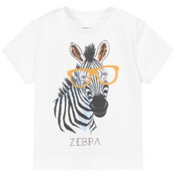 Blue T-shirt for younger boys by Mayoral, made in soft cotton jersey. This interactive top has a fun zebra print in black and white, with a transparent glasses flap.