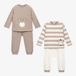 Pack of two ivory, blue and grey trouser sets for baby boys by Mayoral Newborn, made with soft, midweight cotton jersey with a brushed feel inside. Both tops have cute little dinosaur appliqués in grey and blue, with embroidered star details, and they fasten with poppers on the back. The grey marl and blue joggers have an elasticated waist for comfort.
